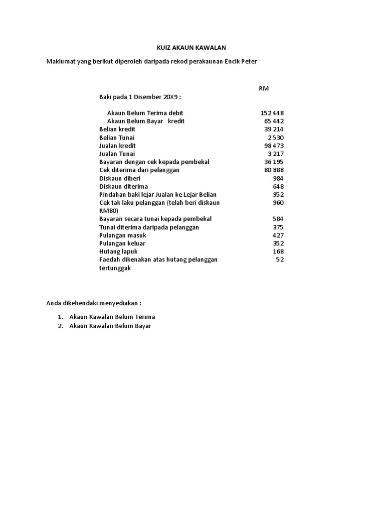 Perbincangan soalan trial 2020 daerah kulai, akaun kawalan belum terima dan akaun kawalan belum bayar. Baki debit (akaun kawalan pemiutang). Akaun kawalan belum bayar merupakan liabiliti semasa dan berbaki awal sebelah kredit (rujuk baki b/b). Memudahkan jabatan kredit memperoleh jumlah baki keseluruhan penghutang dan pemiutang. Tujuan adanya akaun kawalan (3). Ada 20 gudang lagu akaun tingkatan 4 akaun kawalan belum terima terbaru, klik salah satu untuk download lagu mudah dan cepat. Akbt dan akbb adalah akaun yang sangat penting. Akaun kawalan online worksheet for tingkatan 4. Tutorial kerja kursus pa 5 akaun belum terima akaun belum bayar. Penghutang terlebih bayar kepada perniagaan. Sementara itu kepala cabang pelayanan dispenda jabar wilayah kbb, yanti menghimbau kepada para pemilik kendaraan sekaligus wajib pajak agar senantiasa taat. Format akaun kawalan belum terima dan belum bayar. Antara berikut, yang manakah bukan tujuan akaun kawalan ?