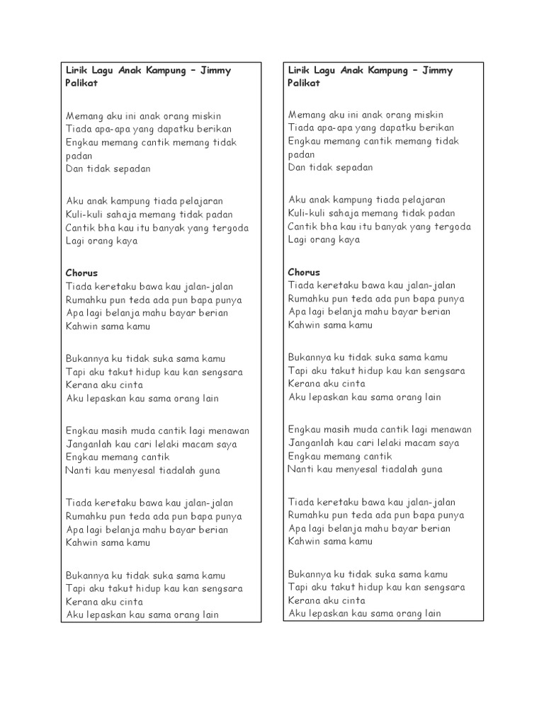 Related : Lirik Lagu Anak Kampung / Aku anak kampung tiada pelajaran kuli kuli sahaja memang tidak padan cantik ba kau itu banyak yg tergoda lagi orang kaya..