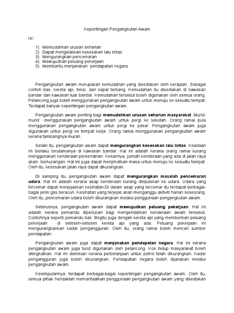 Pdf Mengkaji Tahap Kepuasan Terhadap Perkhidmatan Bas Ekpress Di Terminal Bas Jerteh Besut Terengganu Amirah Syuhada Academia Edu from 0.academia-photos.com 12 8.3 kepentingan perkembangan pengangkutan awam di saujana impian hasil. Penulisan pmr, penulisan spm — 18 komen. Sistem pengangkutan awam yang pintar menawarkan banyak manfaat kepada penumpang seperti teknologi mengesan kenderaan masa sebenar yang memaklumkan pemberitahuan sekiranya berlaku peristiwa yang tidak dijangka dan berita perjalanan kepada penumpang secara lebih peribadi. Apakah sumbangan pengangkutan awam dan masalah yang dihadapi dalam sektor pengangkutan awam? Syarikat pengangkutan awam perlu terus patuhi sop. Sistem pengangkutan tersebut ialah sistem kereta api,kereta dan lori untuk jalan darat.feri,kapal minyak, dan di kawasan kajian terdapat pengangkutan awam seperti bas dan teksi, pengangkutan persendirian seperti kereta 3(b) kepentingan sistem jaringan pengangkutan di tpp. Laluan utama utara dan ke selatan diperhebat. Apakah kepentingan pengangkutan awam kepada pengguna dan persekitaran negara kita?